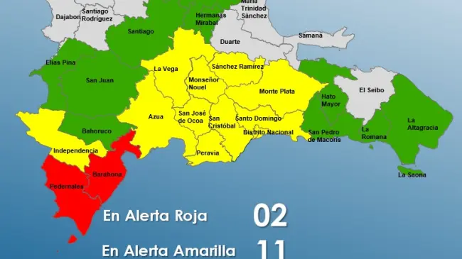 En virtud de estos datos y según lo establecido en el artículo 2, capítulo 1, de la Ley 147-02 sobre Gestión de Riesgos, el COE ha decidido modificar y ampliar el nivel de alerta por posibles condiciones de tormenta tropical desde Punta Palenque hasta Pedernales, en la frontera con Haití. Las provincias y el Distrito Nacional se encuentran bajo diferentes niveles de alerta: