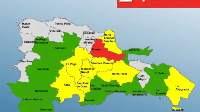 Por otro lado, áreas como Sánchez Ramírez, Monseñor Nouel, La Vega, Puerto Plata, María Trinidad Sánchez, San José de Ocoa, Azua y Monte Plata se mantienen en alerta amarilla.