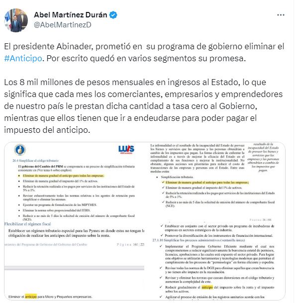 Santo Domingo.– SANTO DOMINGO.- El aspirante presidencial del Partido de la Liberación Dominicana, Abel Martínez, escribió este lunes en su cuenta de Twitter, que el presidente de la República, Luis Abinader, prometió eliminar el anticipo del impuesto sobre la renta a las empresas.