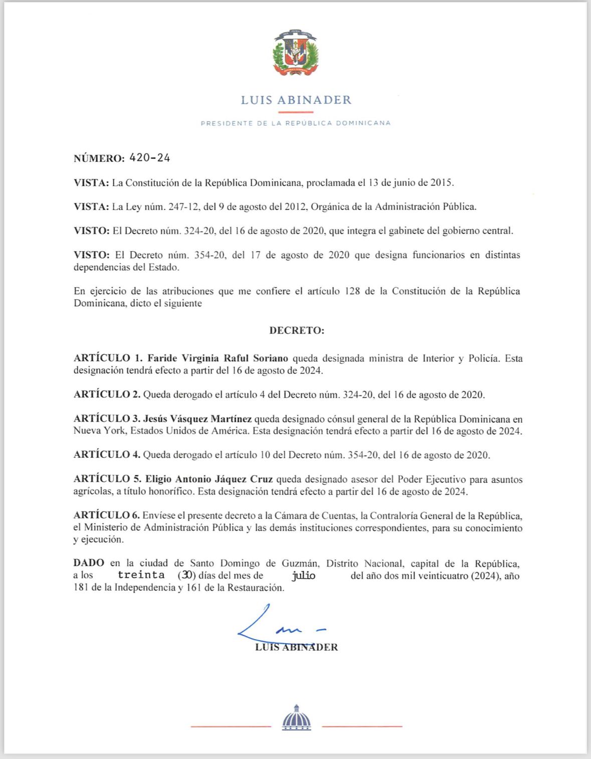 SANTO DOMINGO -.– Santo Domingo. - El presidente de la República, Luis Abinader, designó a Jesús (Chu) Vásquez como cónsul general de la República Dominicana en Nueva York, mediante el decreto 420-24.