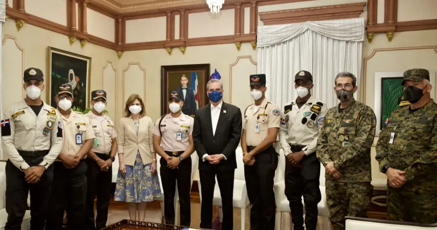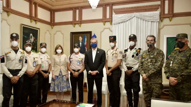 También acompañaron al mandatario a recibir los rescatistas en el Salón Privado de la casa de Gobierno, el ministro de Defensa, teniente general Carlos Luciano Díaz Morfa; el general de brigada del ERD, Manuel Antonio Lachapel de los Santos y el jefe del Cuerpo de Ayudantes Militares, general Celín Rubio.