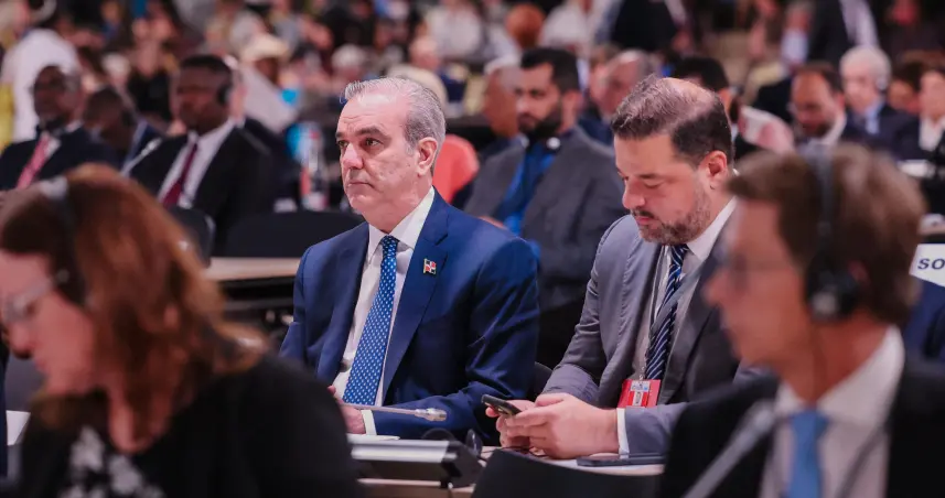 El presidente Abinader asiste a la plenaria en compañía del ministro de Medio Ambiente, Paino Henriquez; el vicepresidente ejecutivo del Consejo del Cambio Climático y Mecanismo de Desarrollo Limpio, Max Puig y Jimmy García, presidente de la Autoridad Nacional de Asuntos Marítimos Saviñón.