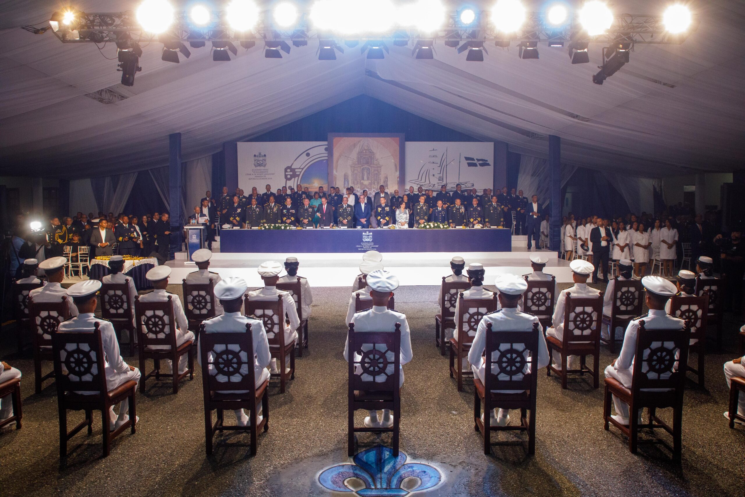 El presidente Luis Abinader encabezó esta ceremonia de graduación correspondiente a la Septuagésima Tercera (LXXIII) Promoción de Damas y Caballeros Guardiamarinas, clase 2020-2024, a quienes tomó juramento y entregó el sable de mando.