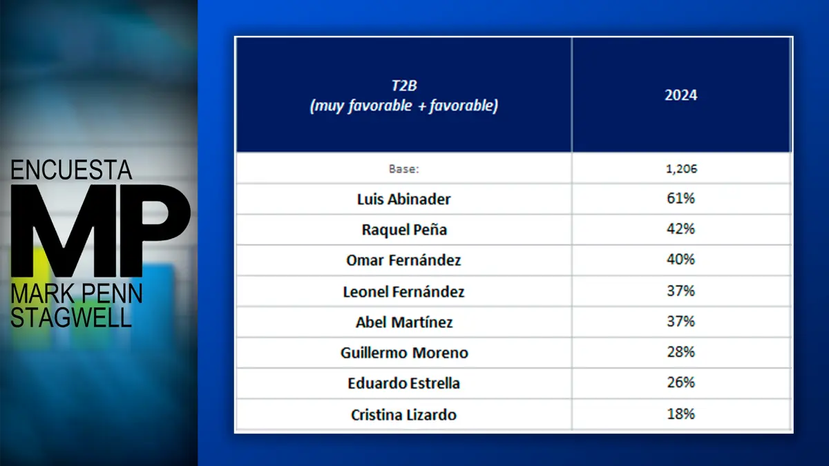 Cuando buscamos la diferenciación neta, es decir, restando los desfavorables a los favorables, Luis Abinader y Raquel Peña, ambos del partido del gobierno, son los que tienen una percepción neta favorable más alta. Omar Fernández saca un 12% neto favorable. Luego todos los otros so vistos más desfavorablemente que favorablemente.