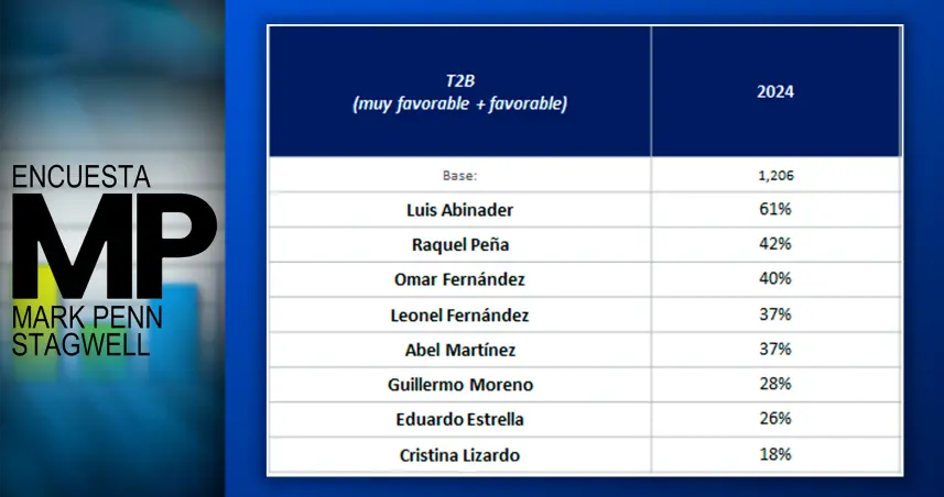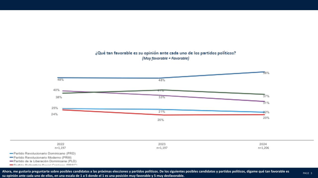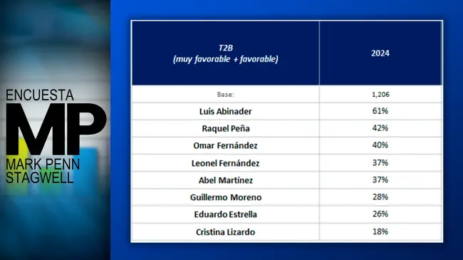 Cuando se pide indicar la favorabilidad ante cada uno de los candidatos un 61% citó a Luis Abinader, un 42% a Raquel Peña, un 40% a Omar Fernández, un 37% a Leonel Fernández, un 37% a Abel Martínez, un 28% a Guillermo Moreno, un 26% a Eduardo Estrella y un 18% a Cristina Lizardo.