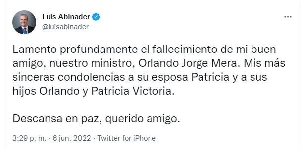 “Lamento profundamente el fallecimiento de mi buen amigo, nuestro ministro, Orlando Jorge Mera. Mis más sinceras condolencias a su esposa Patricia y a sus hijos Orlando y Patricia Victoria, Descansa en paz, querido amigo”, escribió el mandatario en su cuenta de Twitter.