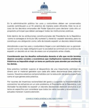 Santo Domingo.– SANTO DOMINGO.- Ante la situación de crisis por la que atraviesa el país producto de la pandemia, el presidente Luis Abinader decidió no declarar en el año 2021 un tema especial para atender como de costumbre.