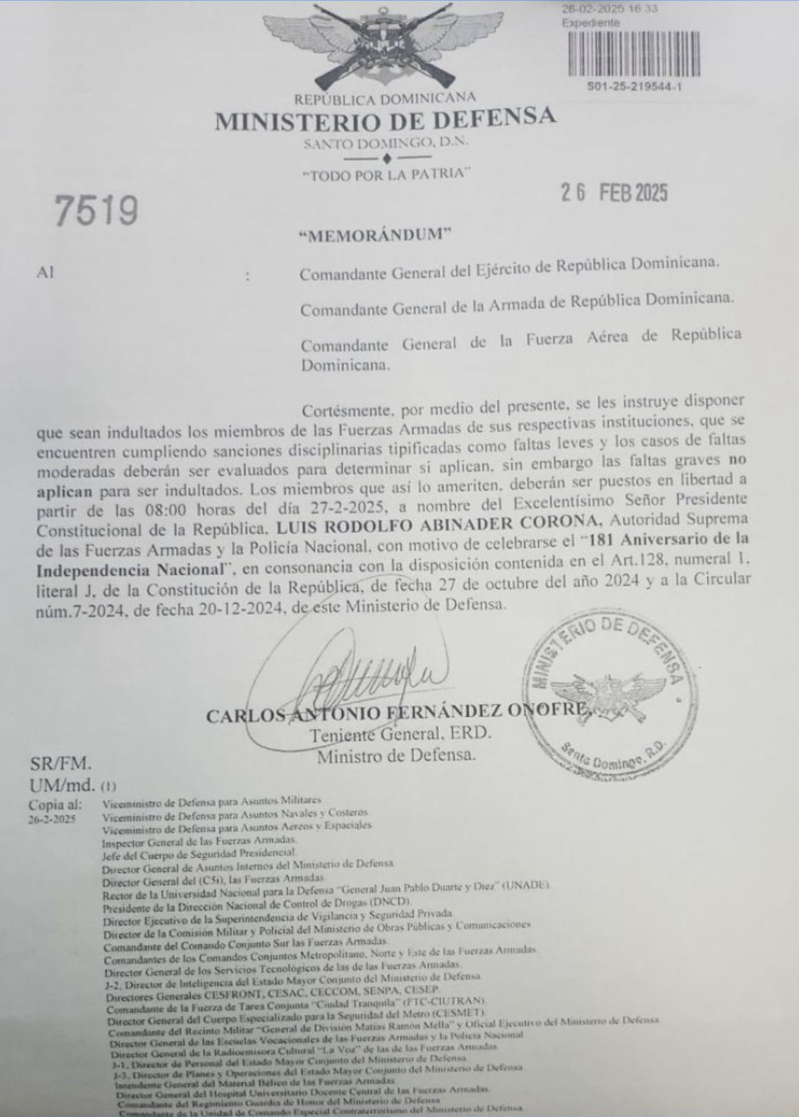 Santo Domingo.– SANTO DOMINGO.- El presidente Luis Abinader ejecutó un memorándum de indulto para los miembros de las Fuerzas Armadas que cumplen sanciones disciplinarias tipificadas como faltas graves, en conmemoración del 181 aniversario de la Independencia Nacional.