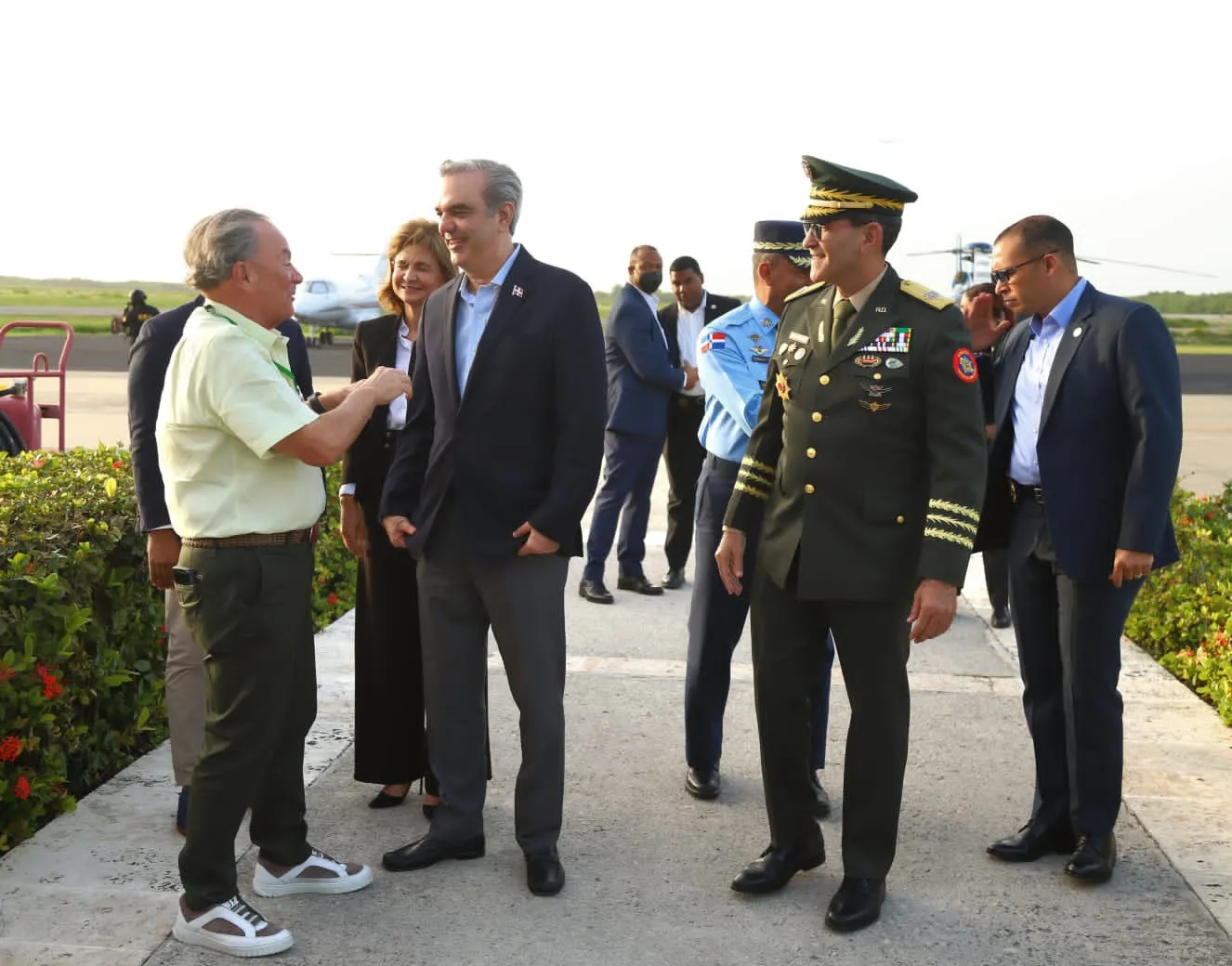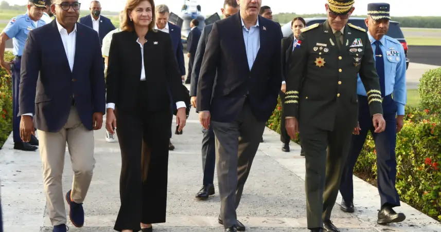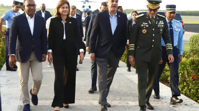 La comitiva que lo acompaña la integran el ministro de Relaciones Exteriores, Roberto Álvarez; su asistente personal, Mercedes Pichardo; Eilyn Beltran, secretario general de Gabinete del Palacio Nacional, y el general Jimmy Arias Grullón, subjefe del Cuerpo de Seguridad Presidencial.