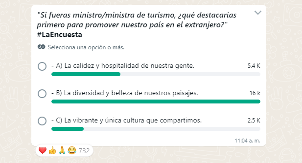 Con la encuesta, los usuarios y participantes tuvieron la oportunidad de elegir las respuestas con varias opciones. Entre estas se incluían “la calidez y hospitalidad de nuestras gentes, la diversidad y belleza de nuestros paisajes, y por último la vibrante y única cultura que compartimos”.