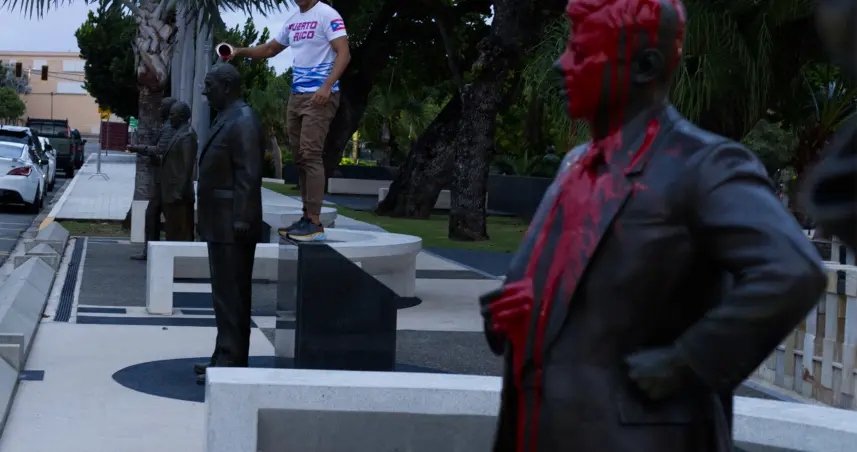 Redacción Internacional.– Redacción Internacional.- Tres activistas lanzaron la tarde de este martes pintura roja sobre las estatuas de presidentes estadounidenses del Paseo de los Presidentes, en la avenida de la Constitución, en el Capitolio de San Juan, como respuesta a los recientes insultos contra la isla caribeña.
