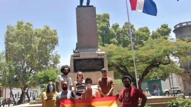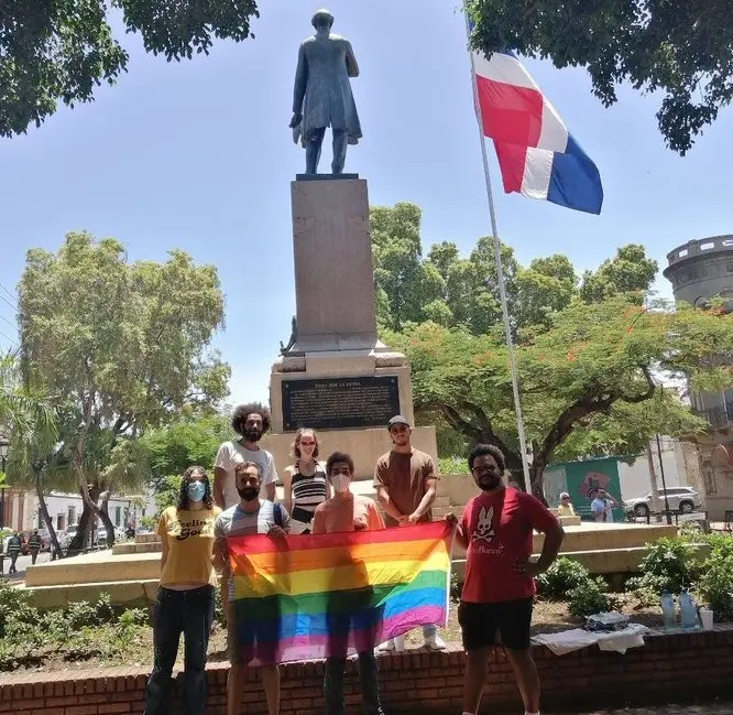 Santo Domingo.– SANTO DOMINGO.- Circula en redes sociales una foto de un grupo de activistas LGTB, tomada en el parque Duarte de la Zona Colonial de esta capital, con la bandera de la comunidad, insinuando que el patriota era homosexual mientras protestaban, de inmediato la policía intervino a la acción.