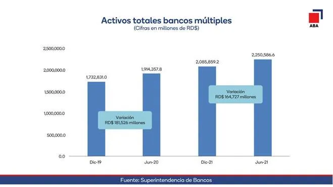 SANTO DOMINGO.- Los activos de la banca múltiple de la República Dominicana registraron un valor total de RD2,250.6 mil millones a junio de 2021, reflejando un crecimiento de RD$164,727.4 millones durante el primer semestre del año, es decir 7,9% más que el período anterior, informó la Asociación de Bancos Múltiples de la República Dominicana (ABA), al tiempo de resaltar que estos resultados fueron en consonancia con el desempeño de la economía en la primera mitad del año.