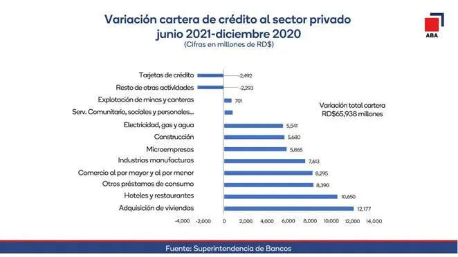 La ABA detalló que, en referencia al crédito al sector privado, en términos brutos aumentó en RD$65,938 millones, para un incremento del 6.4% durante los seis primeros meses del año, generado principalmente por los recursos adicionales destinados a la adquisición de viviendas, hoteles y restaurantes, préstamos de consumo, comercio al por mayor y al por menor, industria manufacturera, microempresas, construcción; electricidad, gas y agua, entre otros sectores.