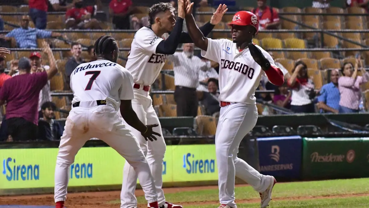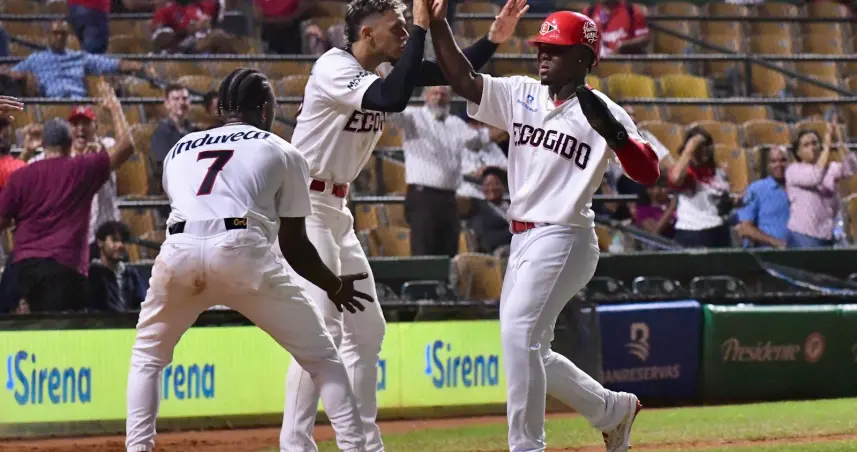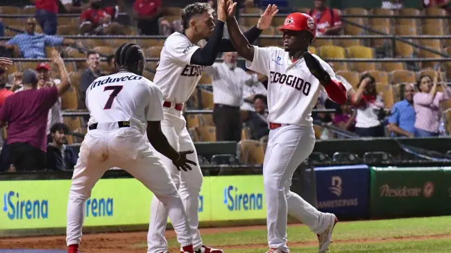 Las primeras dos anotaciones de los locales llegaron frente a Raúl Valdés en el tercer acto con el estacazo de Caminero (su primero en Lidom) por el jardín izquierdo. Los melenudos marcaron una más en el séptimo contra Joel Peguero cuando, con corredores en las esquinas, Sandro Fabián bateó piconazo por el campocorto llevando a la goma Steward Berroa desde la antesala.