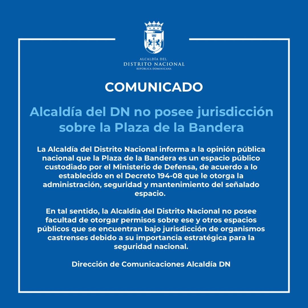 Santo Domingo.– Santo Domingo.- La Alcaldía del Distrito Nacional informó que la Plaza de la Bandera es un espacio público custodiado por el Ministerio de Defensa, de acuerdo con lo establecido en el Decreto 194-08 que le otorga la administración, seguridad y mantenimiento del señalado espacio.