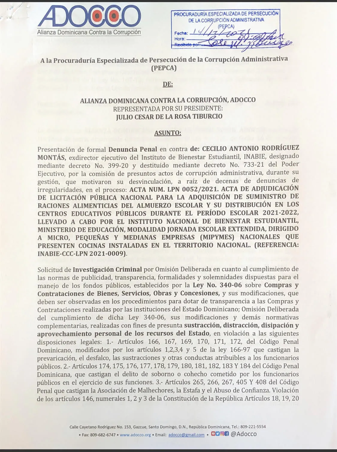 SANTO DOMINGO.- La Alianza Dominicana Contra la Corrupción, ADOCCO, presentó ante la Procuraduría de Persecución de la Corrupción Administrativa, PEPCA, una formal denuncia en contra de Cecilio Antonio Rodríguez Montás, ex director ejecutivo del Instituto de Bienestar Estudiantil, INABIE, por supuestas irregularidades en el proceso de adjudicación de la licitación pública nacional para la adquisición de suministro de raciones alimenticias del almuerzo escolar durante el período escolar 2021-2022.