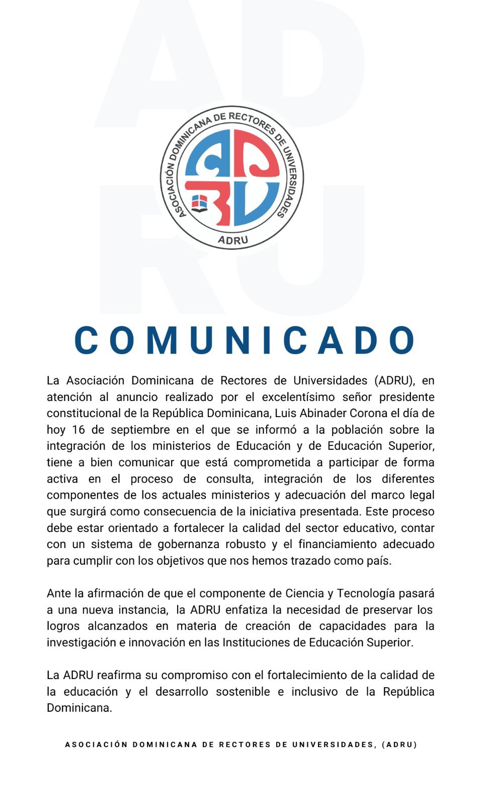 Santo Domingo.- La Asociación Dominicana de Rectores de Universidades (ADRU) emitió un comunicado en respuesta al anuncio del presidente Luis Abinader sobre la integración de los ministerios de Educación y de Educación Superior. Asimismo, reafirma su compromiso de participar activamente en el proceso de consulta y adecuación del marco legal que surgirá de esta iniciativa.