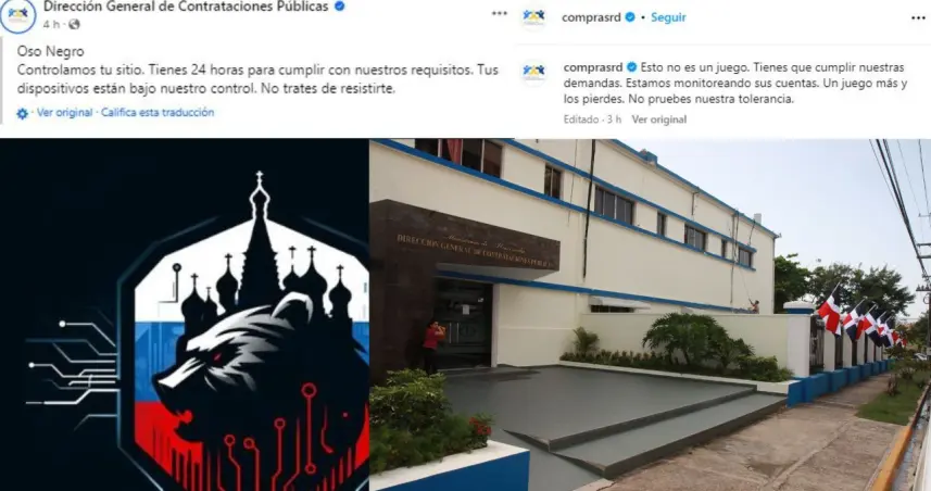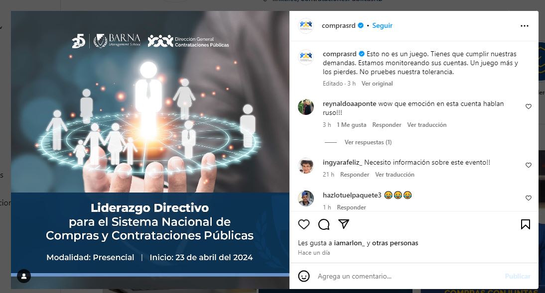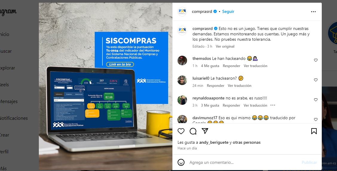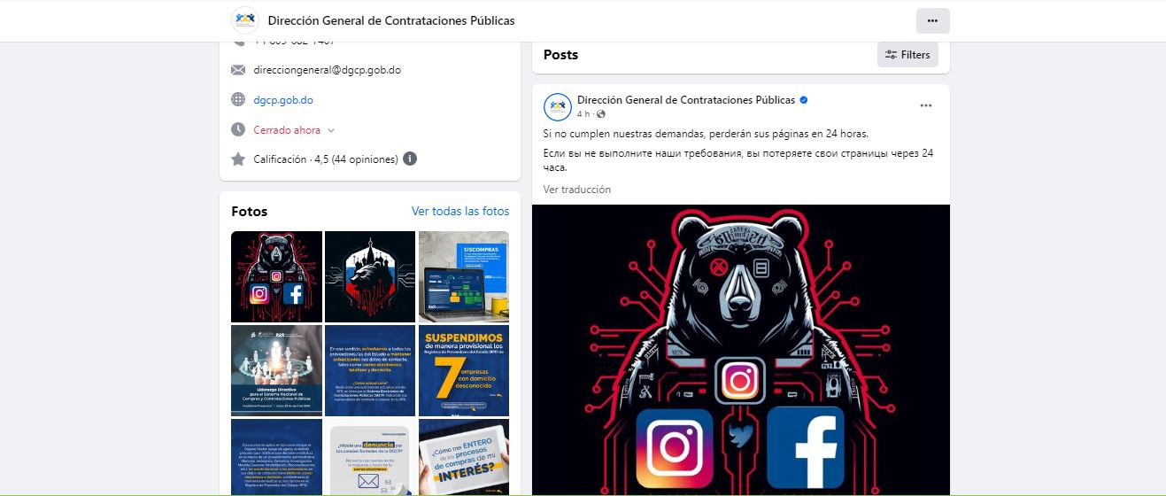 Santo Domingo.– Santo Domingo.- “Si no cumplen nuestras demandas, perderán sus páginas en 24 horas”, así se lee en una publicación escrita en ruso, en la cuenta de Instagram de la Dirección General de Contrataciones Públicas, tras esta red social social al conjunto de Facebook haber sido hackeadas este miércoles, según informó la institución.