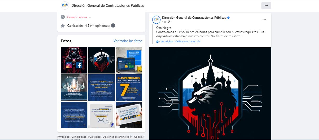 Advertencias de hackers en cuentas de Instagram y Facebook de Contrataciones Públicas