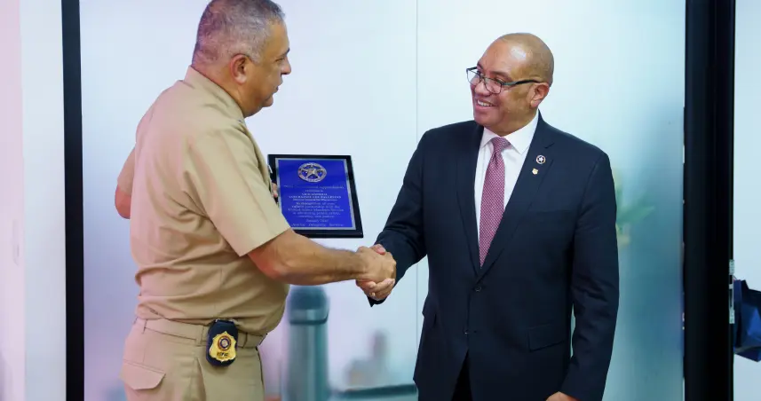 El titular de la DGM recibió la placa durante una visita de cortesía que le hizo el funcionario norteamericano, quien estuvo acompañado de Melissa Hyatt y Jacobo Green, sub directores de la USMS. También participaron Silvestre del Rosario, sub-jefe agregado regional, y Sasha Zacarías, supervisora investigadora.