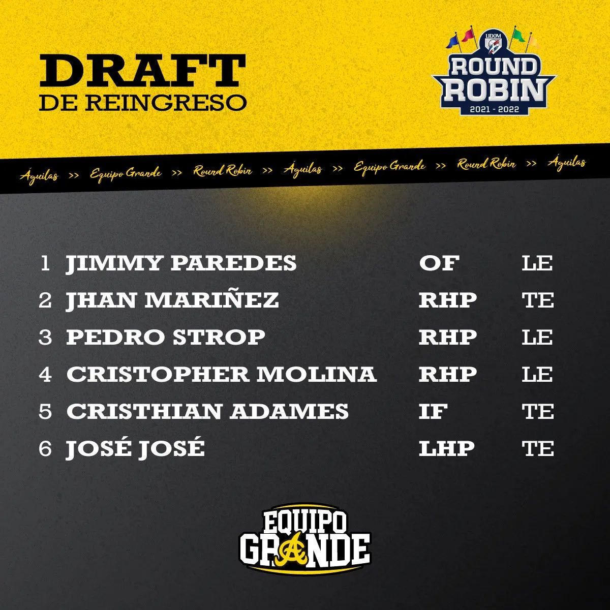 SANTIAGO.- Las Águilas Cibaeñas anexaron cuatro lanzadores y dos jugadores de posición a su elenco, en el sorteo de jugadores reingresos para el Todos Contra Todos que se inicia el próximo lunes.