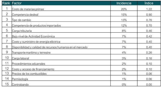 En posición que puede considerarse intermedia, factores como la competencia de productos importados, el bajo nivel de la actividad económica, costo y suministro de energía eléctrica y la carga tributaria también afectaron la competitividad, aunque en menor medida que los antes mencionados.