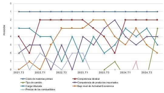 En cuarto lugar, se ubicó la competencia de productos importados, con una incidencia de un 12%, seguido de la carga tributaria con incidencia de 8% y que se encontraba en tercer lugar en julio-septiembre 2024.