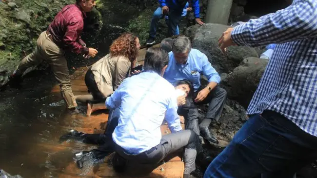 El percance provocó el susto de quienes avanzaban por el cruce, ubicado a unos 20 metros de profundidad en la barranca de Amanalco, y provocó lesiones al alcalde, la presidenta del DIF, Luz María Zagal, las regidoras Wendy Salinas y Patricia Torres (que se fracturó el pie), y por lo menos otras siete personas.