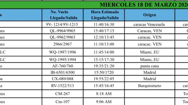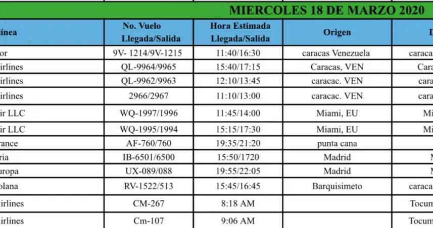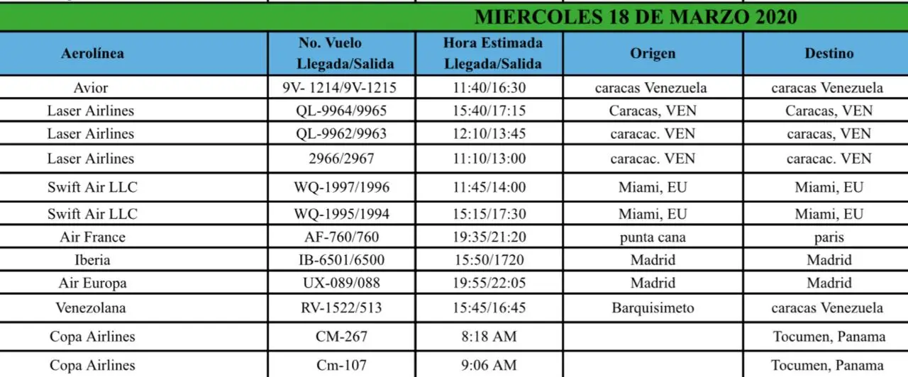 Los vuelos son: Caracas, Venezuela (Laser Airlines), Miami, EEUU (Swift Air), Madrid, España (Iberia y Air Europa), París, Francia (Air France), Barquisimeto, Venezuela (Venezulana), Ciudad de Panamá y Panamá (Copa Airlines)
