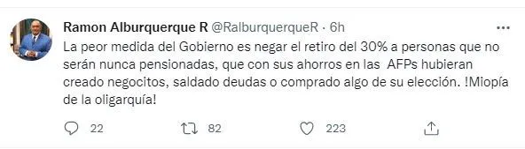 “La peor medida del gobierno es negar el retiro del 30% a personas que no serán nunca pensionadas, que con sus ahorros en las AFPs hubieran creado negocitos, saldado deudas o comprado algo de su elección. ¡Miopía de la oligarquía!”, publicó Alburquerque mediante su cuenta de Twitter.