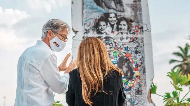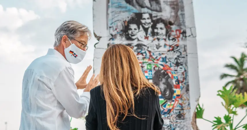“Como usted bien señalaba, yo también pensaba de la hermosa coincidencia de que nosotros estaremos cumpliendo en muy pocos días, el 30 de mayo, 60 años de libertad. Donde un grupo de jóvenes en representación de muchos y de un país que estaba oprimido y sometido a esa dictadura, decidieron dar un paso adelante y entonces finalmente hoy gozamos de esta libertad de hablar lo que queremos y de disfrutar de una democracia, gracias a ellos. De igual manera, hoy tenemos este pedazo del muro que cayó en Berlín y que representa justamente esa lucha por los derechos humanos, por las libertades, por la igualdad. Qué lindo que haya coincidido también y que sea tan simbólico. Todos esos simbolismos dicen y nos confirman lo especial que es y será, como una representación de nuestra amistad; de la amistad de la República Dominicana, del Distrito Nacional, con Alemania, con Berlín”, manifestó.