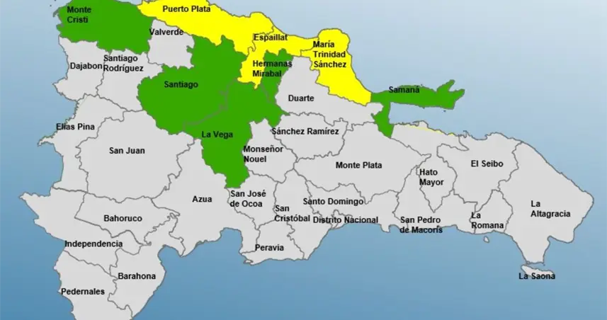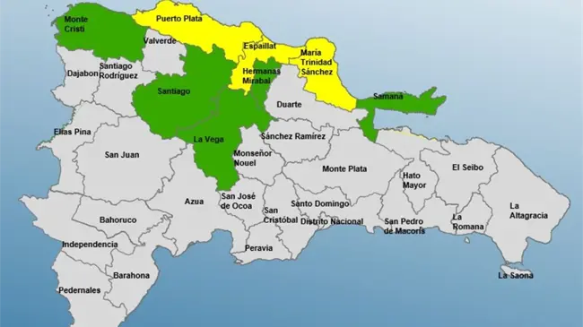 En alerta amarilla se encuentran las provincias Espaillat, María Trinidad Sánchez y Puerto Plata, mientras que en alerta verde están Santiago, Samaná, Hermanas Mirabal, La Vega y Monte Cristi.
