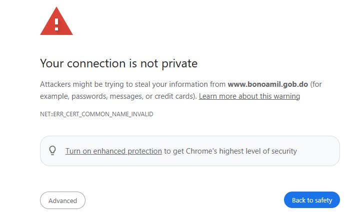 Sin embargo, por confusión muchos padres está accediendo a la antigua página del Bono a Mil, bonoamil.gob.do, que está emitiendo el mensaje "Your connection is not private" o "Tu conexión no es privada", lo que indica un problema con el certificado de seguridad del sitio.