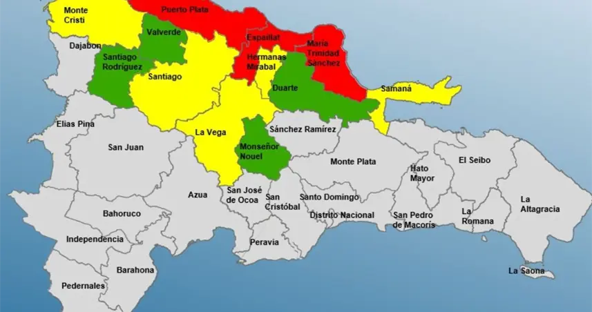 En alerta amarilla se encuentran Santiago, Hermanas Mirabal, Monte Cristi, Samaná y La Vega, mientras que en alerta verde figuran Santiago Rodríguez, Duarte, Valverde y Monseñor Nouel.
