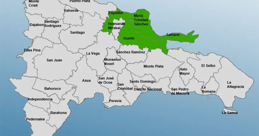 Entre las demarcaciones con mayor incidencia de lluvias figuran Puerto Plata, Espaillat, Santiago, Monseñor Nouel, Santiago Rodríguez, Dajabón, Elías Piña, La Vega, María Trinidad Sánchez, Duarte, Samaná, Sánchez Ramírez y Hermanas Mirabal, entre otras cercanas.