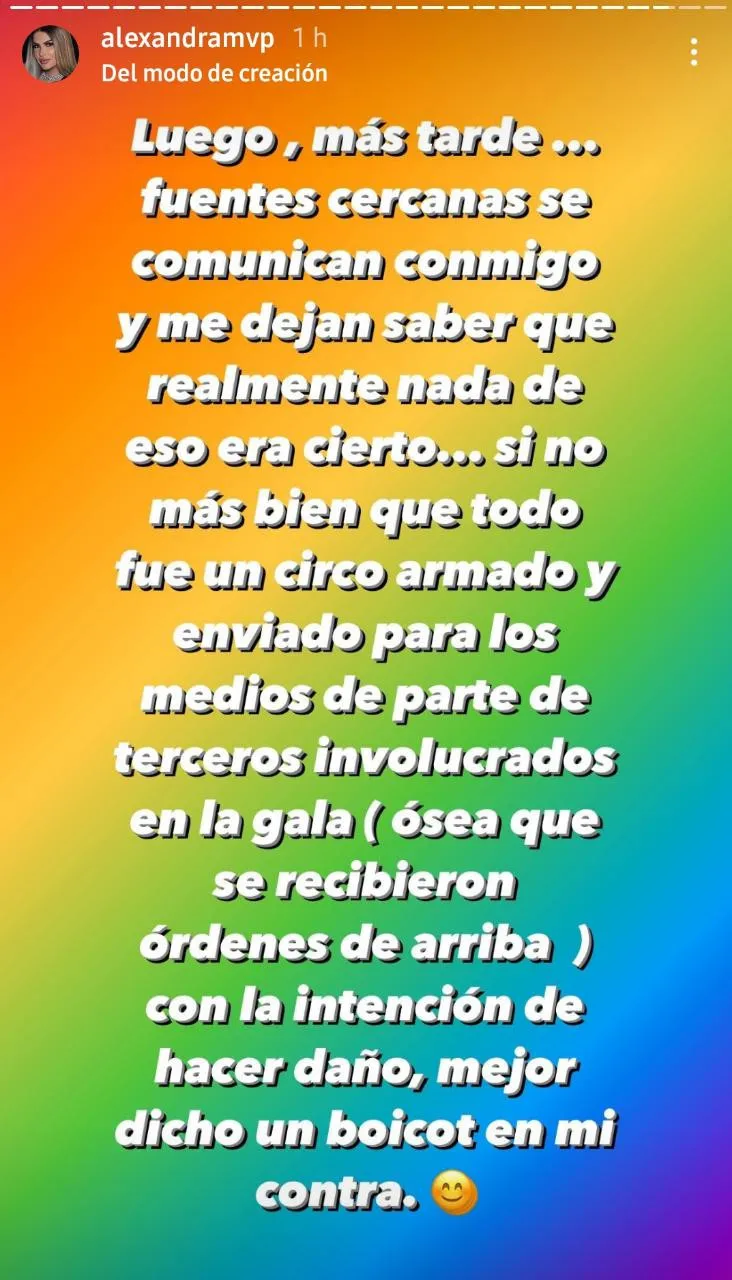 “Fue un circo armado y armados para los medios de parte de terceros involucrados en la gala con la intensión de hacer daño mejor dicho un boicot en mi contra”, dijo.