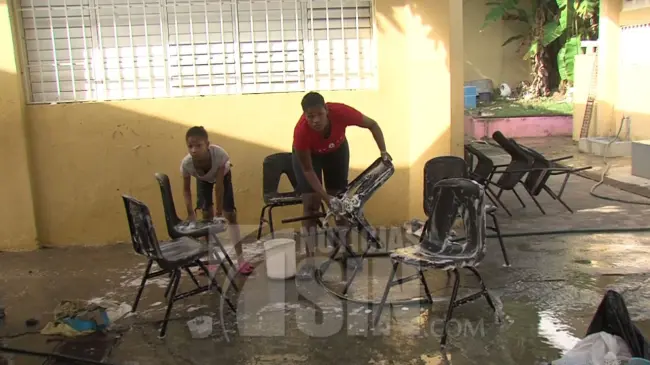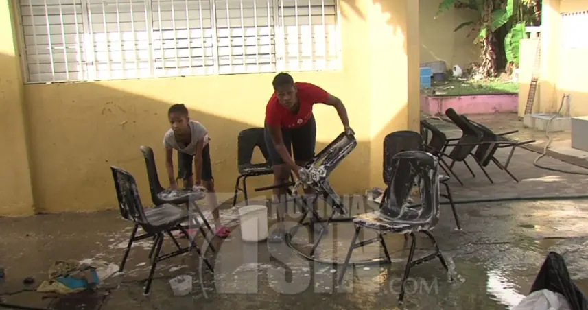 Mientras este lunes la comunidad educativa de la escuela República del Japón del sector Bellas Colinas de Manoguayabo se unió para limpiar el lodo y los escombros que invadieron el plantel.
