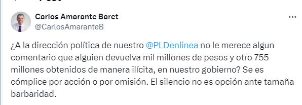 En base a esta información, Baret publicó en su cuenta de X que “¿A la dirección política de nuestro PLD no le merece algún comentario que alguien devuelva mil millones de pesos y otro 755 millones obtenidos de manera ilícita, en nuestro gobierno?”.