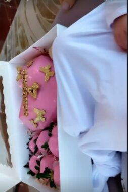 La modelo compartió un video en el que se ve una parte del cuerpo de su tercera hija acompañada de una caja con lo que parecer ser chocolates rosados.