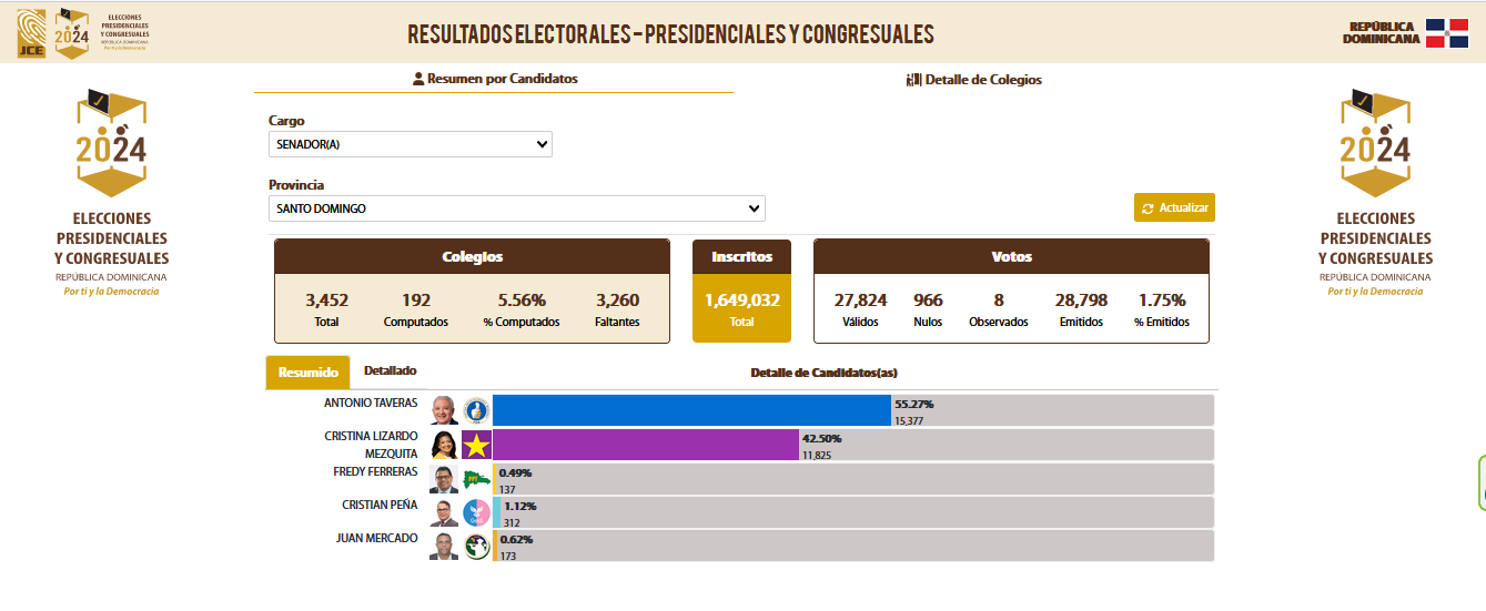 SANTO DOMINGO -.– SANTO DOMINGO. - El candidato por el Partido Revolucionario Moderno (PRM), Antonio Taveras, ha tomado la delantera en el primer boletín de la Junta Central Electoral (JCE) con 55.27% de los votos.