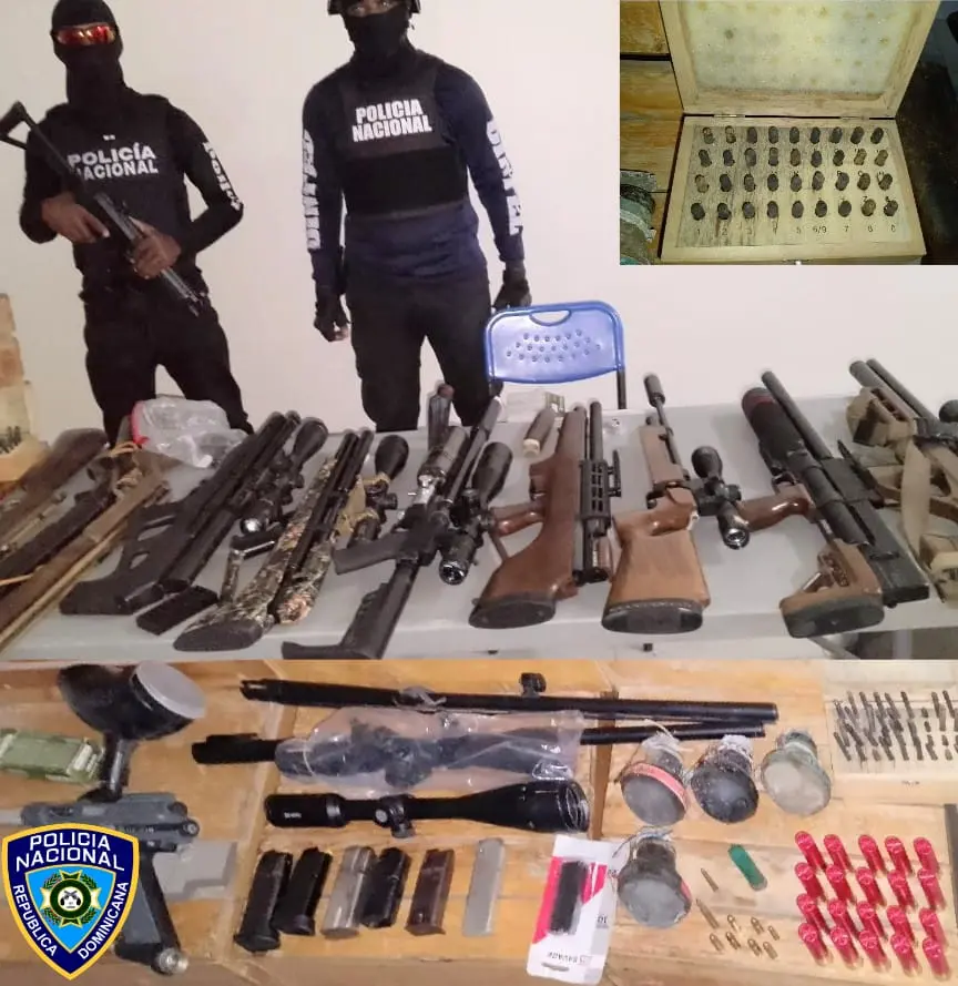 Santo Domingo.– Santo Domingo.- Miembros policiales del Departamento de Inteligencia Delictiva (DINTEL) y de Prevención, en colaboración con el Ministerio Público, apresaron un hombre en posesión de 11 armas de fuego, así como también equipos militares, durante un allanamiento realizado en el municipio de Neyba, provincia Bahoruco.