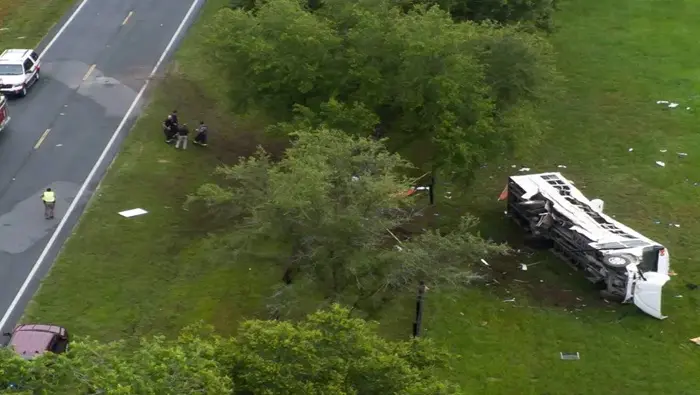 Imágenes del canal Fox muestran el autobús volcado al lado de una cerca de madera y árboles, con considerables daños en su chasis, al igual que la camioneta.