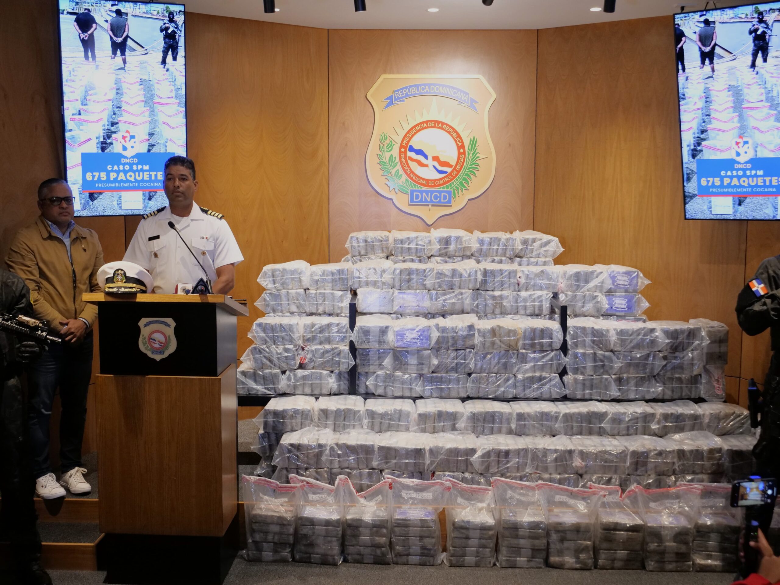 Santo Domingo.– Santo Domingo.- Dos hombres fueron arrestados con un cargamento de 675 paquetes presumiblemente cocaína incautado frente a las costas de la provincia de San Pedro de Macorís, durante un operativo de la Dirección Nacional de Control de Drogas (DNCD), la Armada de República Dominicana, la Fuerza Aérea y agencias de inteligencia del Estado, coordinados por miembros del Ministerio Público.