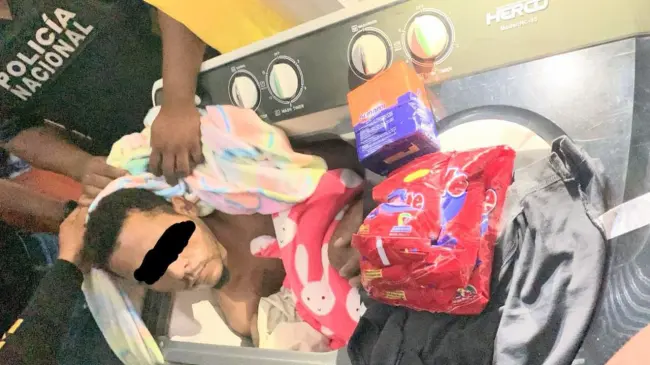 Arrestan hombre escondido en una lavadora, con sustancias narcóticas y un arma de fuego