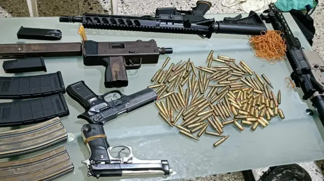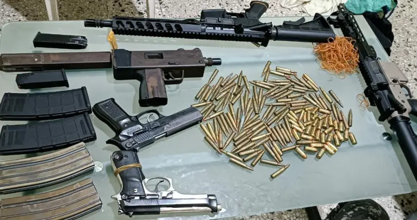 Luego se procedió a requisar dicho vehículo encontrando en el interior un bulto Multicolor que contenía armas de fuego de diferentes calibres tales como: UN (01) FUSIL MARCA: R-15, DE COLOR NEGRO SERIE No. LW378897, UN (01), FUSIL MARCA: R-15 NO LEGIBLE, DE COLOR NEGRO CON CREMA, CON CUATRO (04) CARGADORES Y (112) CAPSULAS CALIBRE 5.56, UNA (01) UZI MARCA: VULCAN, SERIE No. 4545ACPCALD CALIBRE 45, CON SU CARGADOR Y VEINTICINCO (25) CAPSULAS PARA LA MISMA, UNA (01) PISTOLA MARCA: PRIETO VERETA, MODELO: PT92, CALIBRE 9MM, SERIE No. 013019, SIN CARGADOR, UNA (01) PISTOLA MARCA TISAS, MODELO SUPER 9000-S, CALIBRE: 9MM, SERIE No. T0620-06E24505, CON SU CARGADOR Y QUINCE (15) CAPSULAS PARA LA MISMA.