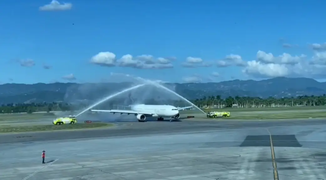 A la llegada del avión Airbus 330 fue recibido con un arco de bienvenida, banderas dominicanas y típicos bailes del Ballet Folklórico del Ministerio de Turismo, llenando de gran alegría a todos los pasajeros quienes además manifestaron su satisfacción de poder aterrizar directamente en Santiago.