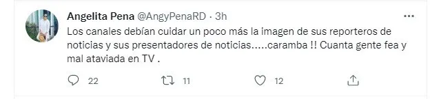 “Los canales debían cuidar un poco más la imagen de sus reporteros de noticias y sus presentadores de noticias… caramba!! Cuánta gente fea y mal ataviada en TV”, indicó Peña mediante su cuenta personal de Twitter.