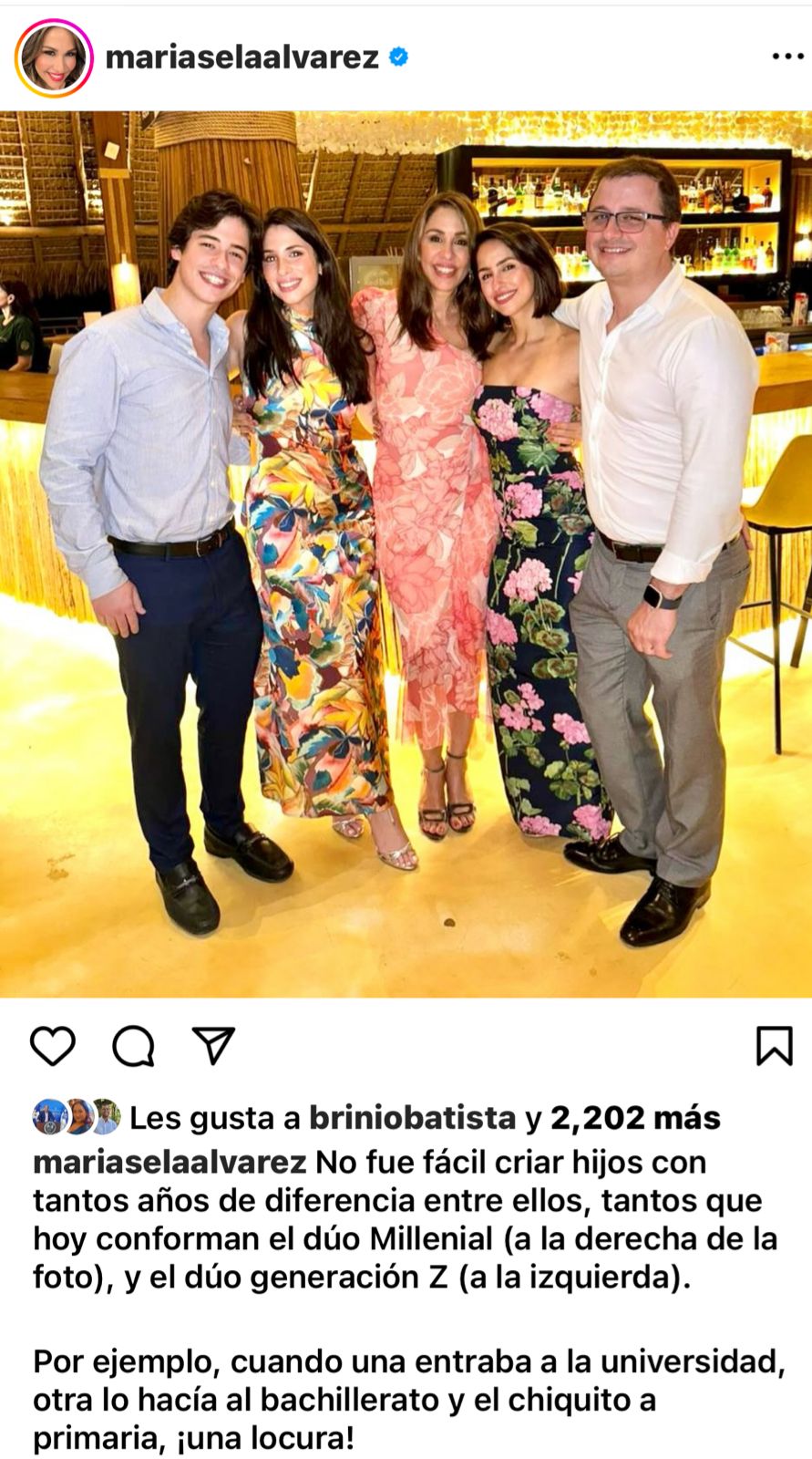 Mariasela Álvarez publicó una imagen junto a sus hijos con una reflexión en el pie de foto emotivo que expresa la dificultad de criar a sus hijos “con tantos años de diferencia entre ellos, tantos que hoy conforman el dúo Millenial”.