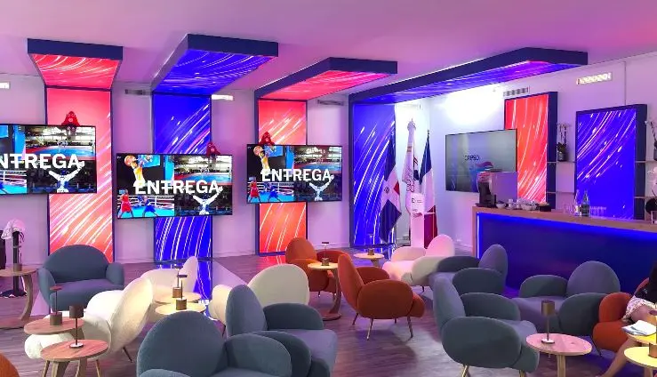 El primer salón, pintando de color blanco, tiene colgado en las paredes varios retratos de atletas del país y el logo de la marca dominicana (DO), además tres pantallas tecnológicas quedan paralelas a los modernos muebles de colores blanco, crema y azul junto a pequeñas mesitas.